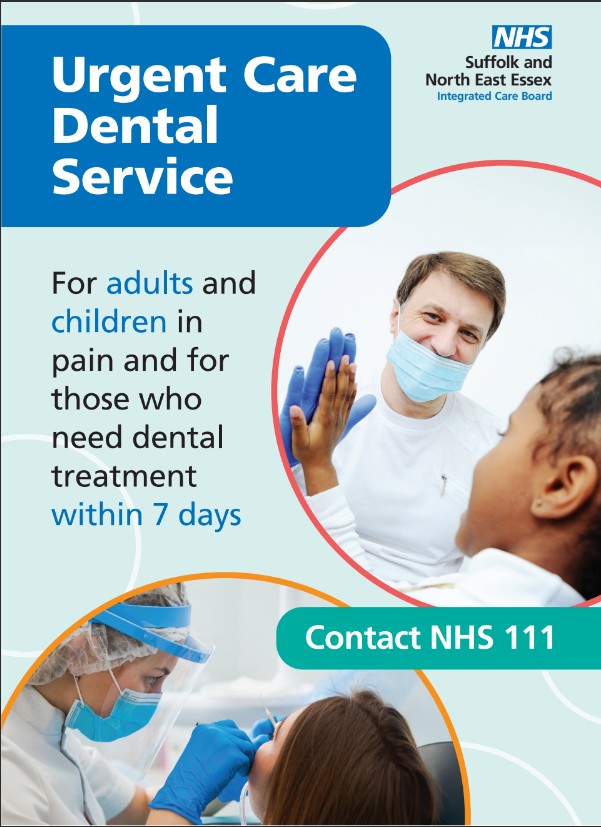 Urgent Care Dental Appointments are available across Suffolk within 1 to 7 days by contacting NHS 111. Adults and children experiencing dental pain, infection and other urgent issues can access NHS care seven days a week, including in the evenings. Go online at 111.nhs.uk or call 111 for an appointment.